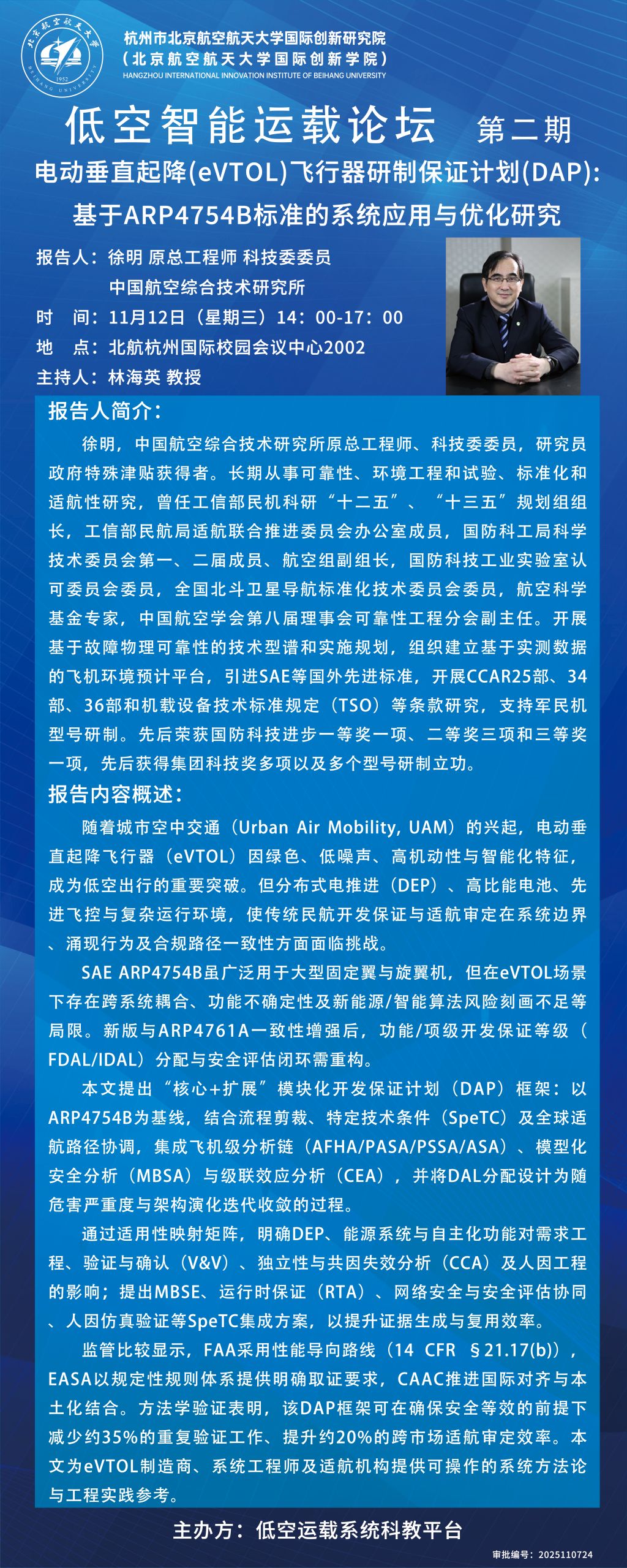 学术讲座《电动垂直起降(eVTOL)飞行器研制保证计划(DAP):基于ARP4754B标准的系统应用与优化研究》