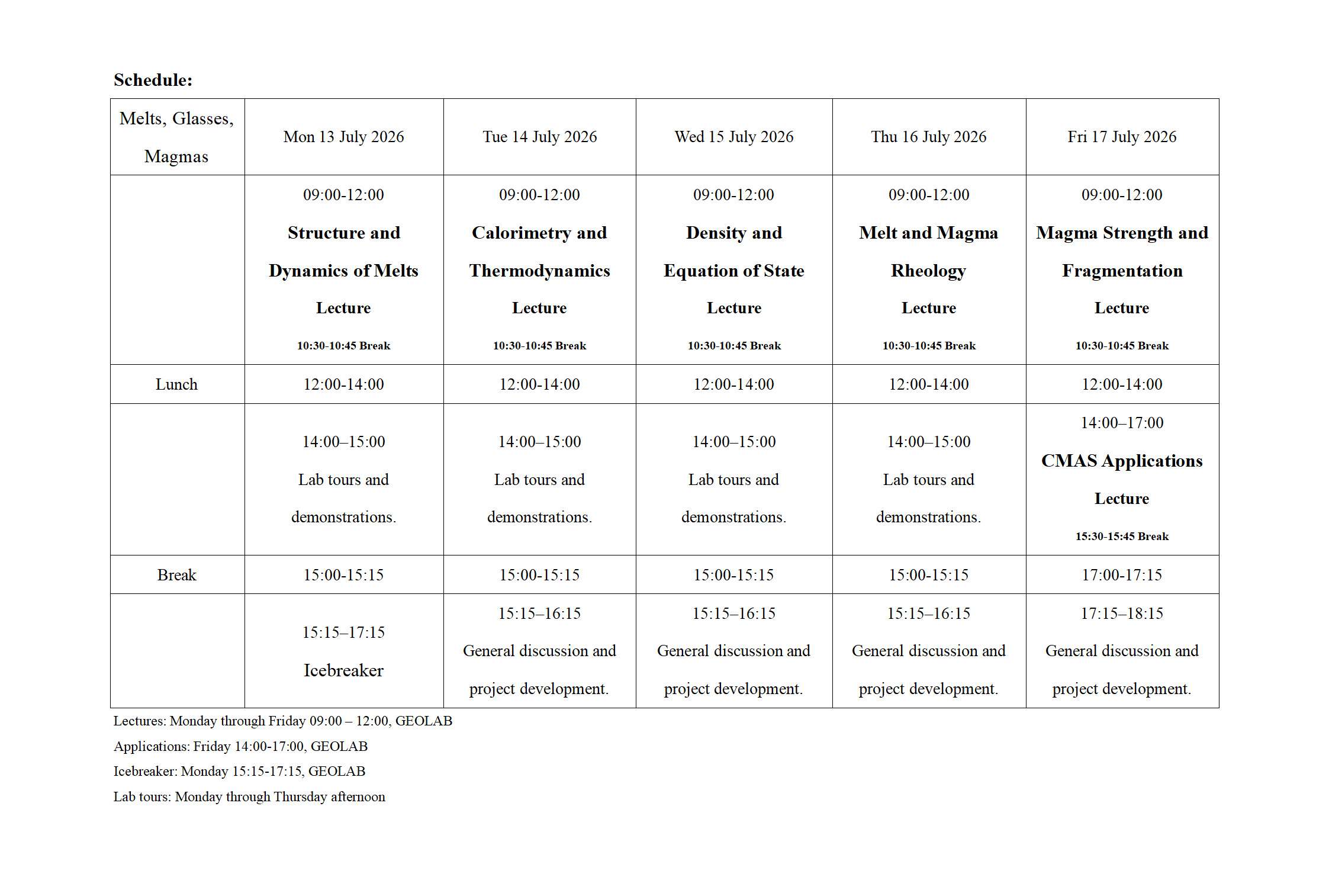 Melts, Glasses, Magmas Short Course--July 13-17, 2026