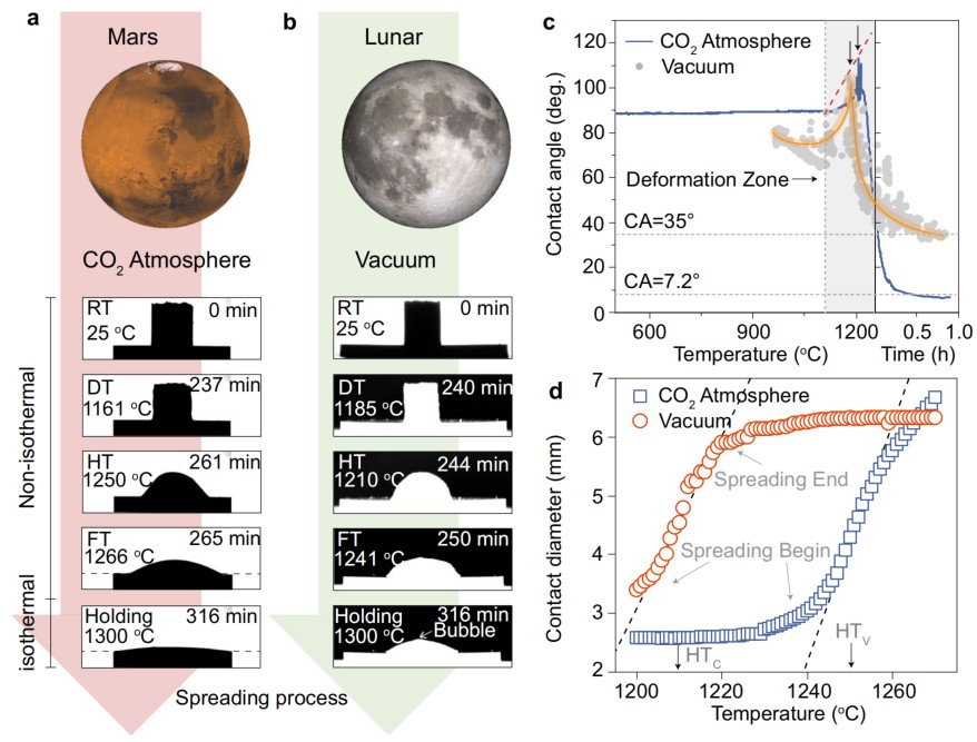 此外,本工作模拟了两个人类重点探索地外天体:火星和月球的陆面主要气氛,观察了环境沉积物的物理铺展过程,展现出熔融温度、铺展速度等明显差异,这使得高温防护材料在行星上的未来应用还包含更多启发之处。