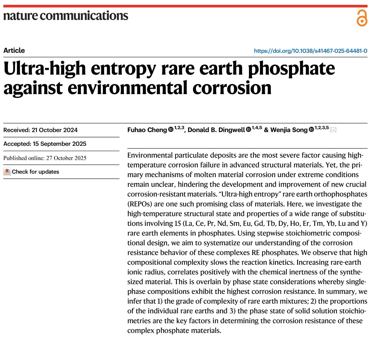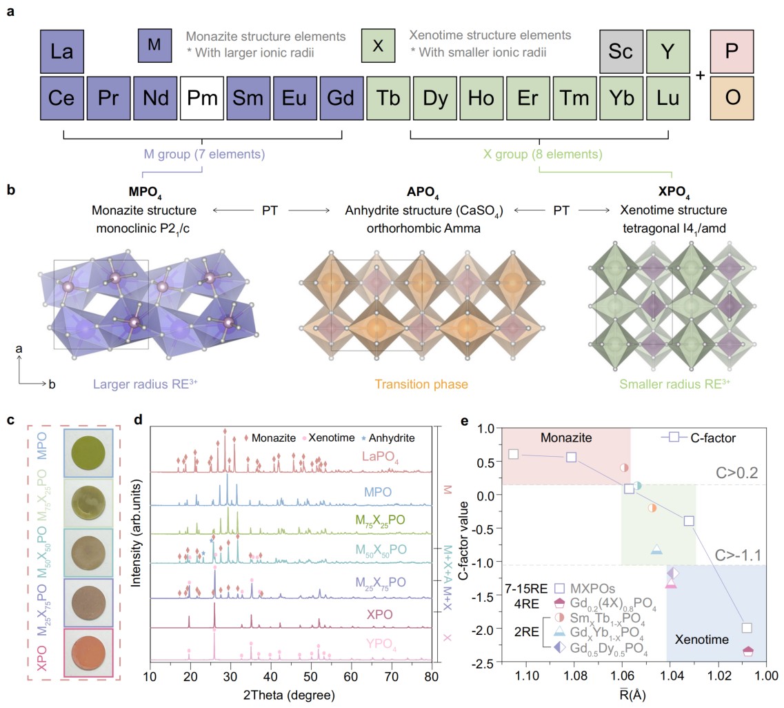 近日,北航国新院空间环境与行星科学国际研究中心(GEOLAB)首席科学家丁马克院士在高温抗腐蚀防护材料领域取得重要进展。团队基于稀土正磷酸盐材料框架辅以“超高熵”化设计思路,且在同一阳离子位点上设计全部可用镧系稀土元素(15种),考察了该材料的单相形成趋势并通过调控固溶体的晶体结构和配比,讨论了其优异的耐环境沉积物腐蚀性能。该工作首次合成了一系列超复杂组分磷酸盐陶瓷,在反应热力学及结晶动力学两方面揭示了其耐腐蚀行为,更为突破高熵磷酸盐材料设计局限、提升其综合性能提供了全新范式与理论框架。相关研究成果以“Ultra-high entropy rare earth phosphate against environmental corrosion”为题于10月27日在线发表于《自然·通讯》(Nature Communications)杂志。该工作也是以高温材料环境腐蚀为核心在该期刊上的首次发表。