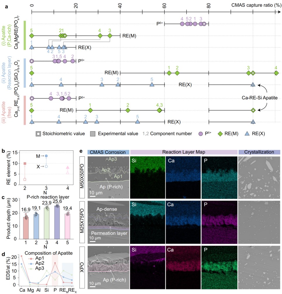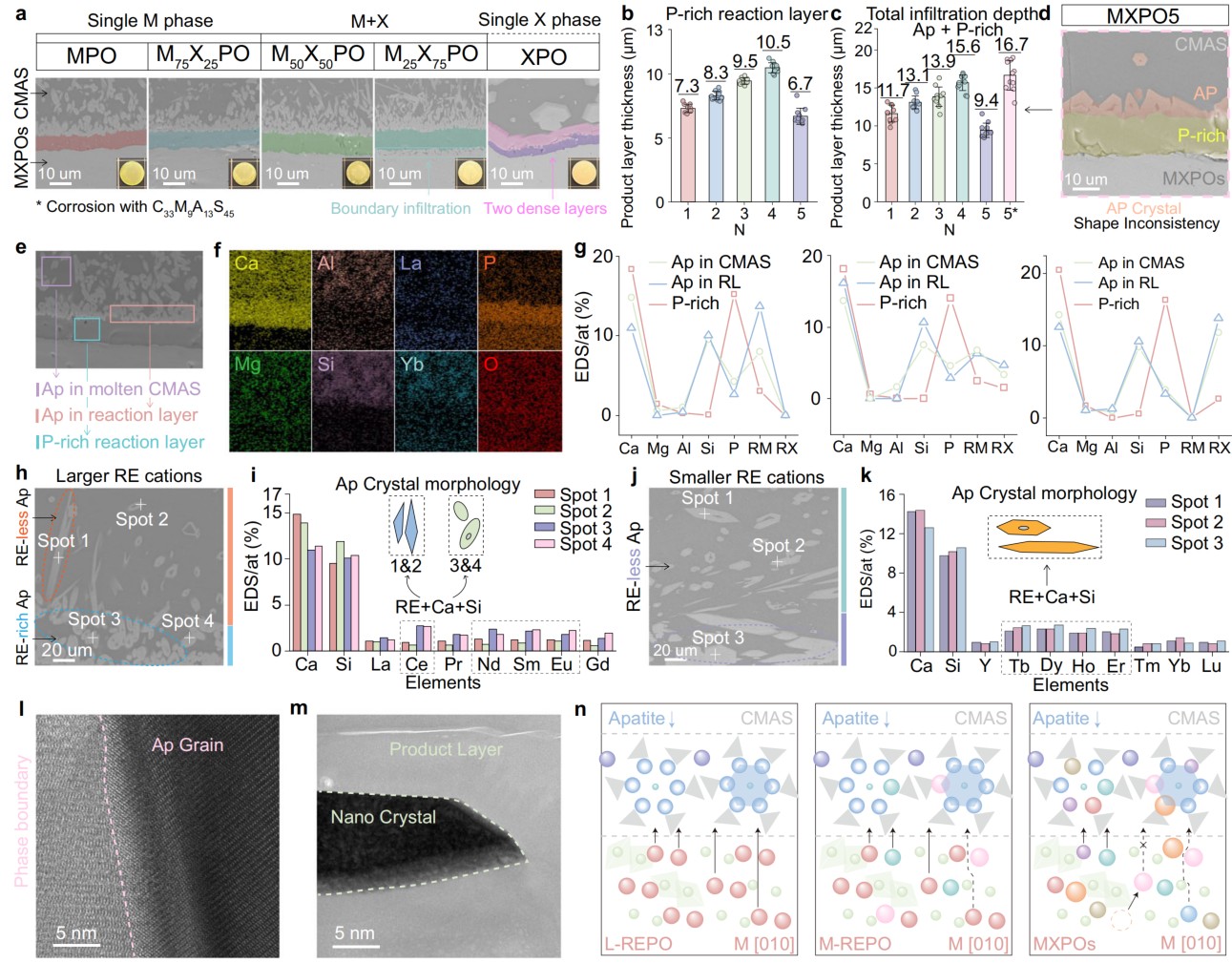 背景:悬浮在地球或地外天体大气中的颗粒物(包括沙、尘、火山灰等)通常采用简化的CMAS(钙镁铝硅酸盐)类模拟物进行研究。这类物质在高温环境下极易熔融,随后附着在结构部件表面并造成持续性损伤。为应对腐蚀风险,具有多样化特性的新型材料组合方案层出不穷,以应对这些极端环境。尽管如此,这类材料面临的主要挑战之一:与环境颗粒相互作用产生的有害效应。其中,稀土磷酸盐近年来作为高温防护材料崭露头角,凭借其优异的高温稳定性和耐腐蚀性。