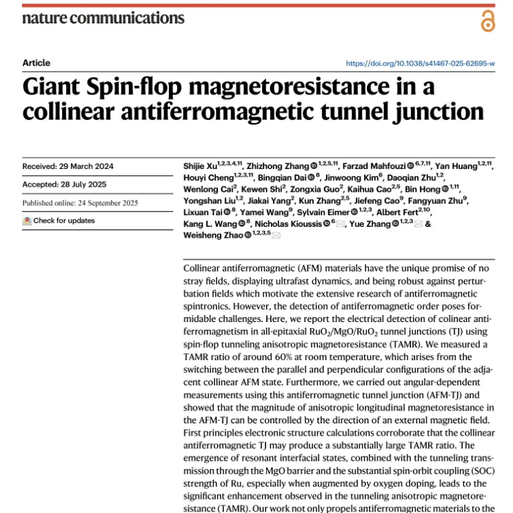近日,北航自旋芯片与技术全国重点实验室赵巍胜教授、张悦教授团队在非共线反铁磁自旋电子学领域取得重要进展。团队在高质量RuO2外延单晶薄膜体系中发现了各向异性的隧穿磁电阻效应,且通过X射线磁圆二色谱、X射线磁线性二色谱、交换偏置等证明了室温反铁磁性的存在。该工作发现了室温共线反铁磁的隧穿效应,证明了RuO2是实现磁性存储的可选材料,为理解反铁磁自旋相关现象提供了新思路。相关研究成果以“Giant Spin-flop magnetoresistance in a collinear antiferromagnetic tunnel junction”为题在线发表于《自然·通讯》(Nature Communications)杂志。