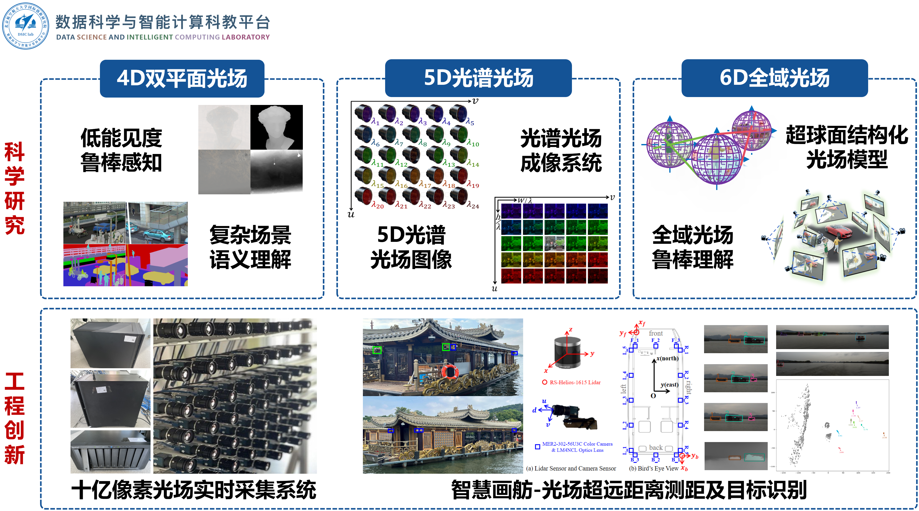 平台长期开展视觉理解、光场成像和AI医疗等领域研究,相关技术在西湖景区、重点医院等进行了推广应用。团队首先提出全域光场理论,围绕光场图像处理发表TPAMI、TIP、CVPR、ICCV等顶级期刊/会议论文60余篇(其中,高被引论文10篇,热点论文4篇);出版国内首部领域相关教材《光场图像处理》;申请/授权专利20余项,相关专利已在西湖景区等多地落地实施;提出首个大规模光场语义分割数据集UrbanLF,是第三届国际光场研讨会LFNAT 2023 CVPR Workshop挑战赛(深度估计、语义分割)指定数据集,也是目前光场图像语义分割领域唯一公认基准数据集;所提出一系列方法长期在光场深度估计通用Benchmark位居前列,获CVPR光场语义分割国际挑战赛冠军;研究成果得到新华社、人民日报、人民网等主流媒体宣传报道。