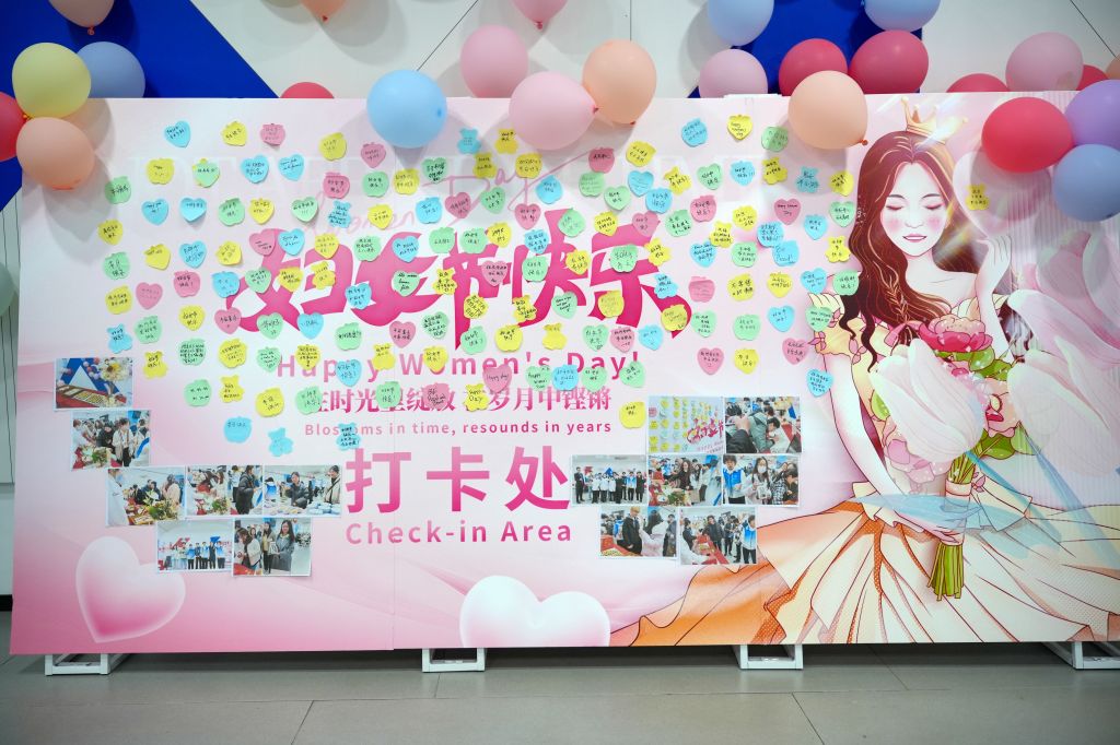 活动当天,食堂笑语盈盈。女生可现场参与抽奖,奖品包括食堂优惠券、头绳、书签、巧克力、小蛋糕等,惊喜连连;男生可在打卡墙上写下节日祝福,贴上一句暖心话语,即可参与抽奖。墙面上很快贴满了真诚的祝福语——“妇女节快乐”“节日快乐,天天开心”“别感冒”……一句句话语,汇聚成春日里最温暖的风景。