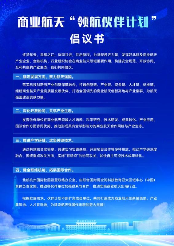 会上,北航国新院联合北航宁波创新研究院、遨天科技(北京)有限公司、星箭科技股份有限公司、杭州地芯科技有限公司、地卫二空间技术(杭州)有限公司、北京星辰道合科技有限公司等26家单位共同发起《商业航天“领航伙伴计划”倡议书》,未来将着力构建安全规范、开放协同、互利共赢的产业生态。
