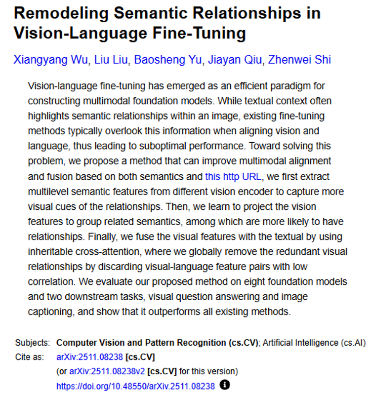 近日,北航国新院人工智能科创中心科研团队研究成果Remodeling Semantic Relationships in Vision-Language Fine-Tuning在全球人工智能国际顶级学术会议“AAAI人工智能大会”(AAAI Conference on Artificial Intelligence)上发布。北航国新院人工智能科创中心2025级硕士生吴湘阳为第一作者、刘柳教授为通讯作者。该研究由北航国新院、人工智能学院、宇航学院联合开展,并与新加坡南洋理工大学(Nanyang Technological University)、英国莱斯特大学(University of Leicester)等国内外科研机构合作完成。