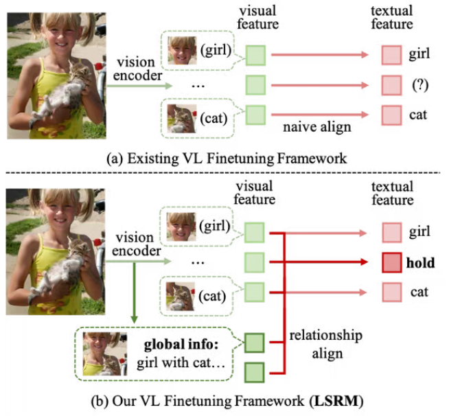随着多模态技术的发展,视觉组件的引入为大模型装上了“眼睛”,使其具备同时处理图像和文本输入的能力,从而适配更广阔的应用场景。而随着应用场景日趋复杂,多模态任务不再拘泥于单一目标的识别,更需要文本提示下对多图像实体的综合理解。例如,对于一张小女孩抱着猫的图像而言,模型不仅识别出“小女孩”、猫这样的语义实体,更要理解“抱”这一关联信息。吴湘阳等人提出的新型视觉语言模型训练框架LSRM(Learnable Semantic Relationship Method),创新性地将视觉编码器内部层的多实体语义关联信息重新利用,并在视觉语言信息的融合阶段引导模型对多实体关联进行建模,使模型自发地关注并学习图像内各语义实体的关系。