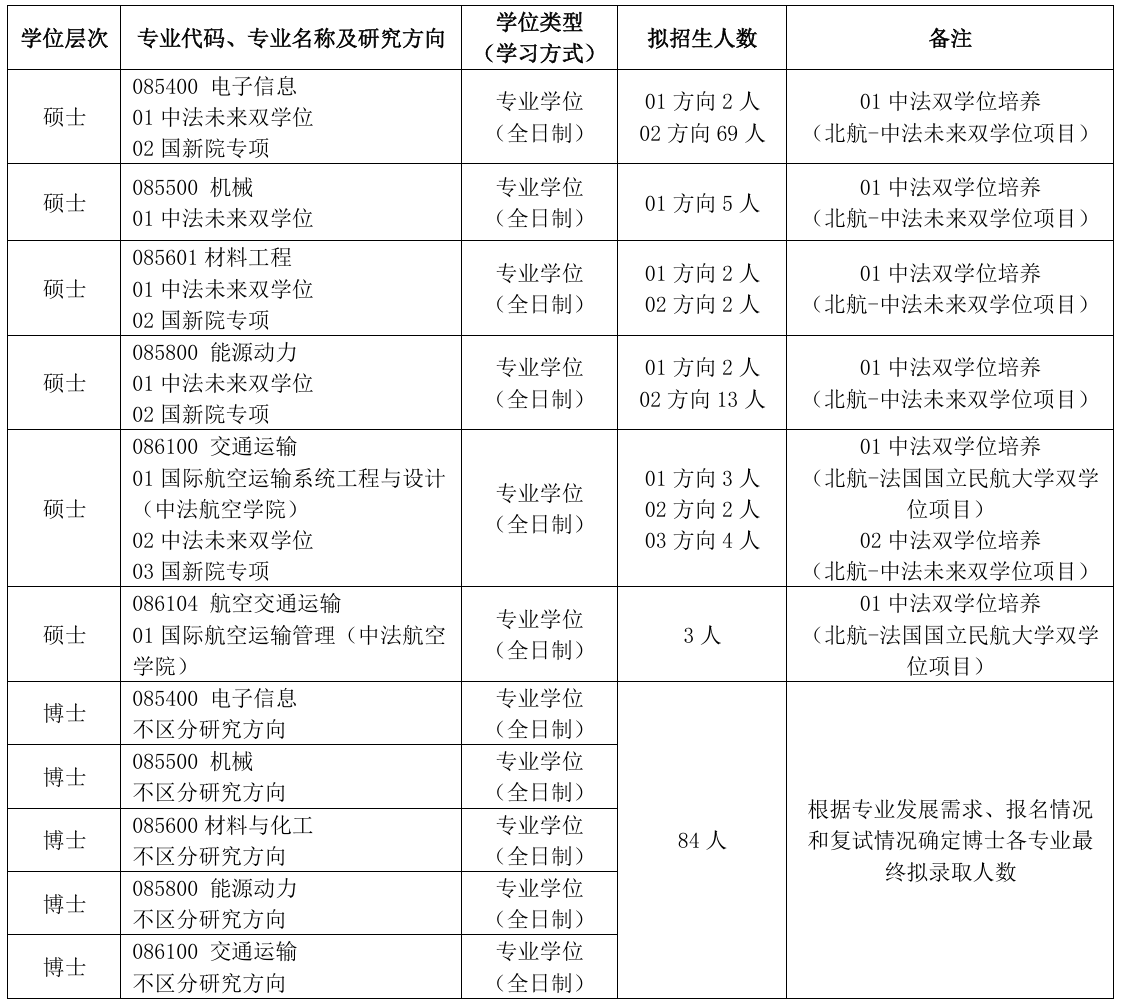 7.085400电子信息、085500机械、085601材料工程、085800能源动力、086100 交通运输、086104航空交通运输,以上6个硕士专业的双学位方向均采用中法联合培养模式,学生在符合中外双方毕业与学位授予条件后,授予双硕士学位:北京航空航天大学硕士学位和法国院校硕士学位。北航-中法未来双学位项目的学费为40000元/人·年,北航-法国国立民航大学双学位项目的学费为30000元/人·年。双学位项目学生第一年在国内培养,第二年起在法国培养一年半,最后半年在国内培养。出国学习期间,住宿、生活等相关费用自行承担。关于两个双学位项目的说明,详见学院官网(https://h3i.buaa.edu.cn/info/1354/3854.htm、http://h3i.buaa.edu.cn/info/1354/3855.htm)。